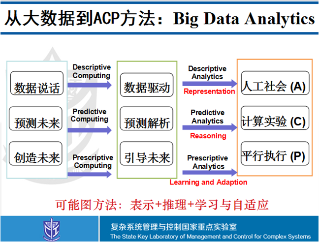 上面两句话归纳起来就是这样三件事,“数据说话”,“预测未来”,“创造未来”;而落实起来,就总结到一个人工社会,一个计算试验和一个平行系统,实现从知识的表示,到决策的推理,到情景的自适应学习和理解的闭环反馈运行。最后一个阶段的Representation,Reasoning,Learningand Adaption正是目前机器学习概率图方法的主要内容。我希望在此基础上还能发展处一个“可能图方法”。