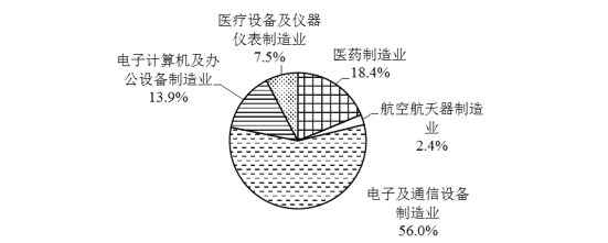 从高技术产业主营业务收入的行业分布看,2015年电子及通信设备制造业主营业务收入所占比重为56.0%,比去年提高近3个百分点;电子计算机及办公设备制造业占比为13.9%,比去年下降了4.5个百分点;医药制造业主营业务收入占比为18.4%,与去年基本持平;医疗设备及仪器仪表制造业主营业务收入占比为7.5%,比上年下降了0.3个百分点;航空航天器制造业占比与去年持平,为2.4%。