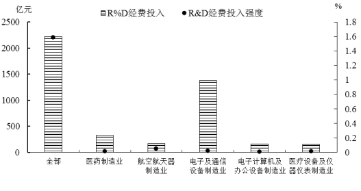 图5 高技术产业R&D经费及其投入强度按行业分布(2015年)