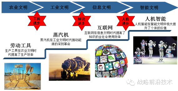 回答这个问题之前,先了解一下笔者对技术文明进化的研究。从下图我们可以看到:农业文明时期,人类是以发明工具来提高生产效率;工业文明时期,人类科技的主要变革是利用化石能源推动蒸汽机;互联网时期,人类通过知识进步提高了万物的连接和使用效率。那么到了人类文明的下一个阶段,“智能文明”注定是通过提高个体价值和创造全新个体来从更高的维度提高社会生产力。人机智能——就是人类科技文明的一个终极归宿。