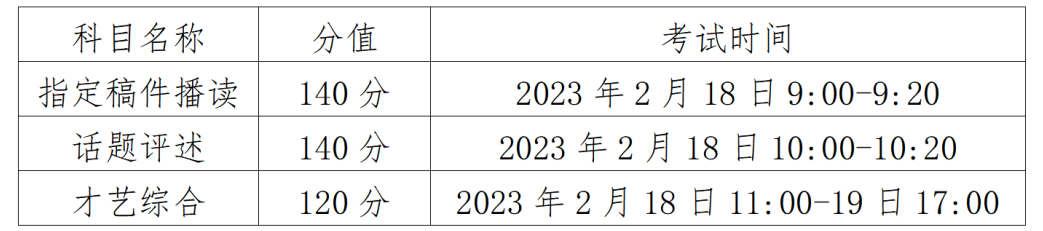 以上三项考试科目,考生不准化妆。其中才艺综合科目的才艺展示形式可为舞蹈、小品、曲艺、器乐、声乐及朗诵等。