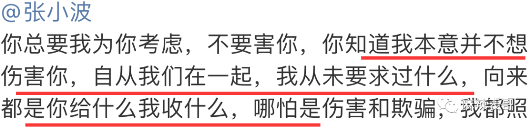 前几天,一个叫“别皱眉了抱抱我吧”的网友,爆料说自己破坏了张小波和九夜茴的家庭。