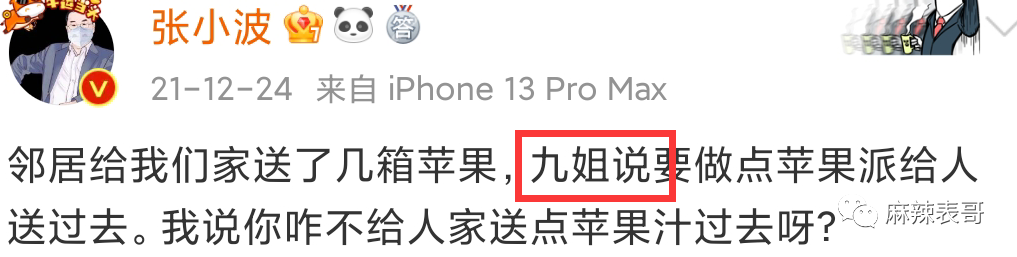 有一位同样是圈内作家,微博名叫“老妖女士”说,张小波其实还有一个原配,和原配白手起家,创立了公司,结果婚内出轨了九夜茴,拖了很多年才离婚。前妻拿钱走人,带着孩子去美国,九夜茴才上位成功。