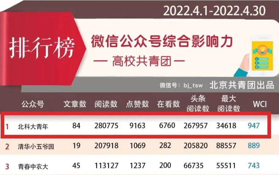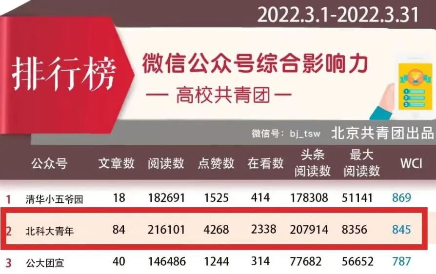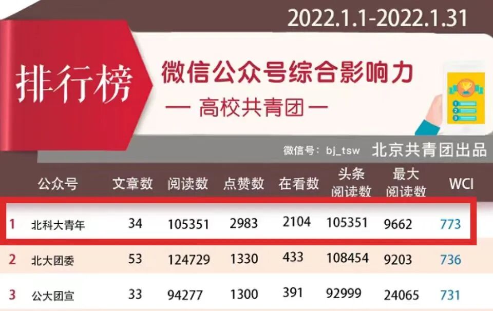 北科大青年微信公众号综合影响力多次位列