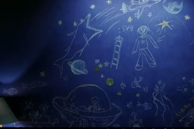 最终,尼克老师说服校长举办一场画画比赛,所有老师和学生都可以参加。这一天,孩子们都脱掉了严肃的校服,做回了真实的自己。色彩在伊桑眼里是会流动的生命,伊桑用哥哥送的画笔,画下了心中五彩斑斓的梦:广袤的夜空繁星点点,一片清澈的湖旁围绕着茂密的山林,小鱼在水中游来游去,一个人坐在岸边凝神看着。