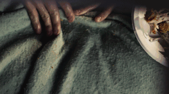 他一边吃,一边用旅店的床单擦拭油腻的双手。