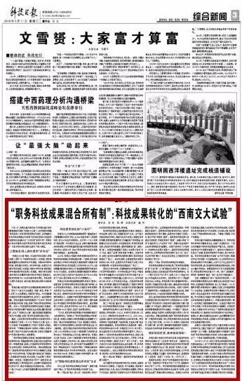 西南交通大学党委书记王顺洪教授在接受采访时说,“党的十八届五中全会提出‘创新、绿色、和谐、开放、共享’五大发展理念,创新居于首位。作为创新源头的高校如何更好地发挥作用,是我们一直在探索的问题。我校在国家大学科技园进行了五年的‘职务科技成果混合所有制’试验,取得了很好的科技成果转化效果。去年10月《促进科技成果转化法》修订实施后,我校充分利用该法赋予高校的完全成果处置权落实奖励权,出台了‘西南交大九条’,通过将奖励权前置简化为知识产权奖励,实现了职务科技成果的混合所有。”