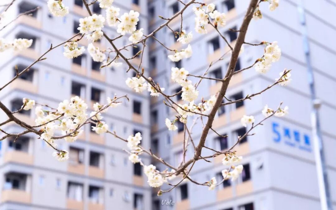 翠绿枝头的衬托下,冽艳粉红与淡雅凝白交相辉映
