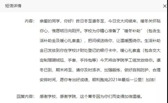 暖冬之约,让幸福多一度。暖冬补助是学校“学党史、办实事”系列活动的重要环节,体现着学校对学生无微不至的关怀与呵护。交大是同学们的第二个家,是身心疲惫时可供休憩的港湾,也是乘风破浪时最有力的保障,愿同学们都能在这温暖的校园里安心学习,高歌猛进,砥砺前行,早日实现与交大的双向赴约!