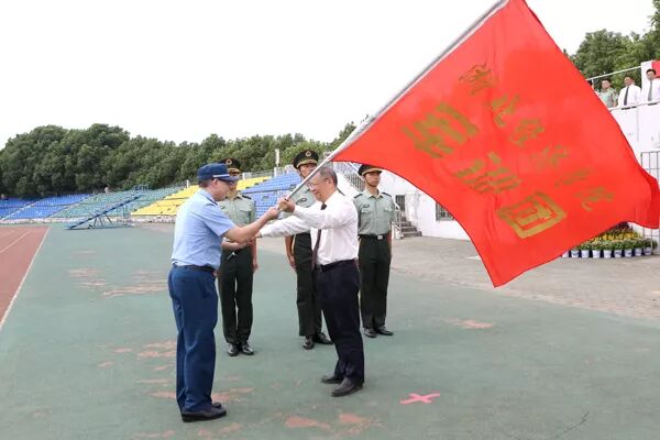 校党委书记温兴生为军训团授旗,军训团团长余相波接旗。