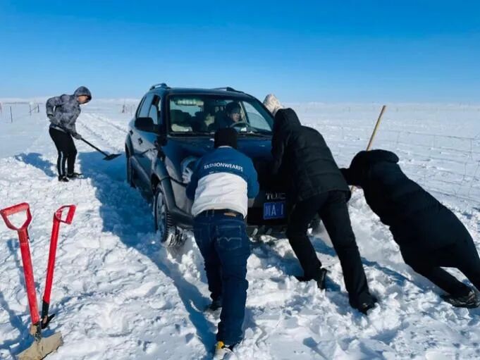 团队成员在雪地里推车 图片来源:蓝爱兰