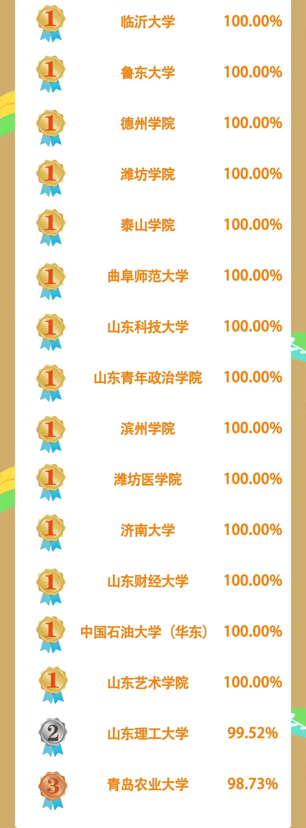 省属高校中,参学率达100%的高校有27所。山东商业职业技术学院稳居冠军宝座,聊城大学、山东工艺美术学院列第二、第三位。