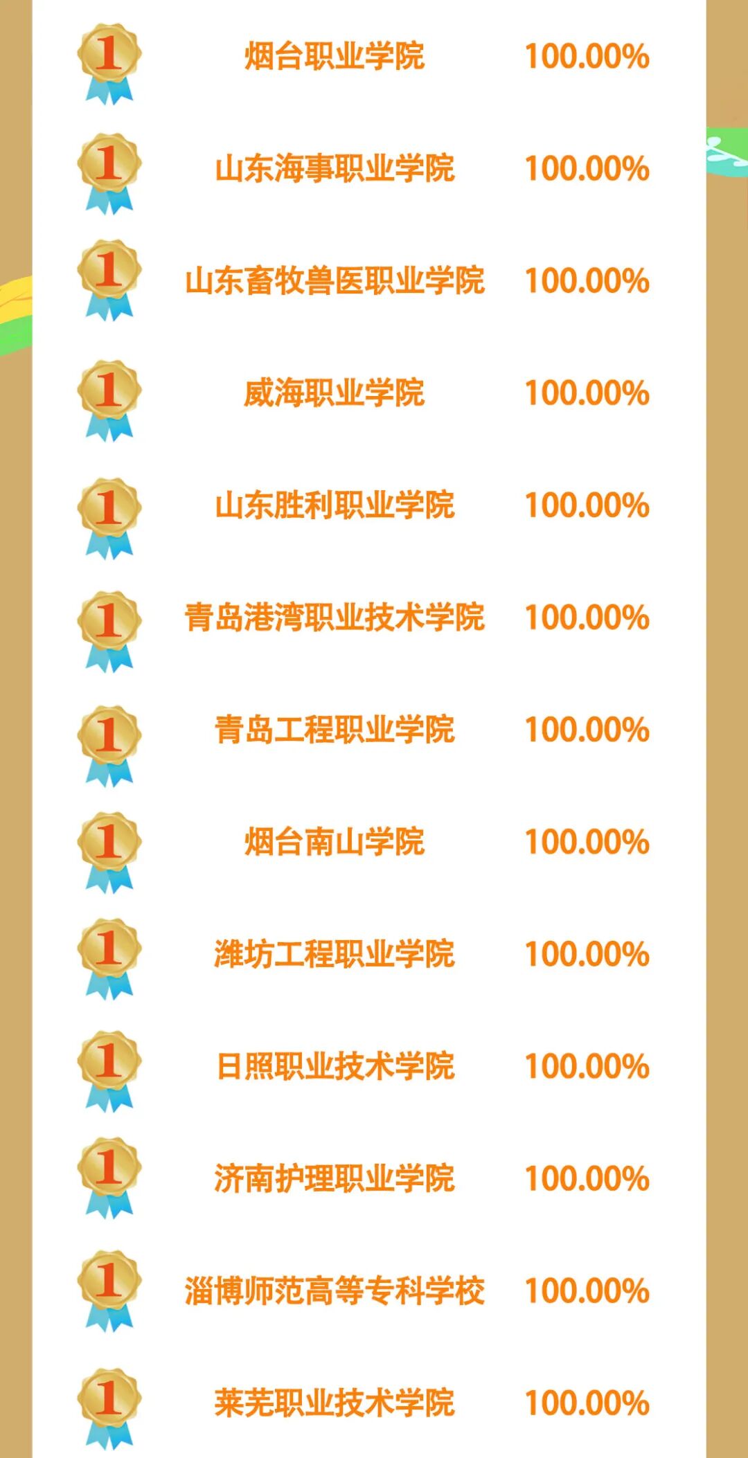 市属高校中,参学率达100%的有97所。滨州科技职业学院获得冠军,潍坊环境工程职业学院、青岛航空科技职业学院列第二、第三位。