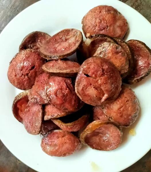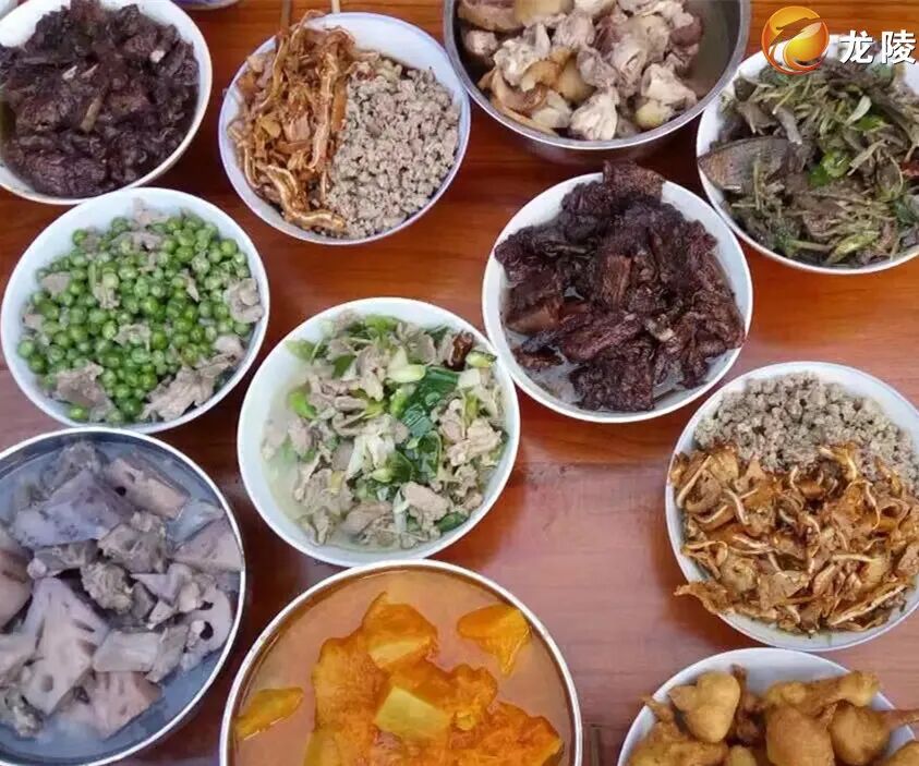 血烩肉也是腊勐的一道特色菜,年前的杀猪饭上,家家户户都少不了这道菜,血烩肉颜色呈紫色,吃起来鲜、嫩、香。做法简单,杀猪的时候准备两三斤笋子,将鲜猪血淋在笋子里拌匀,然后再把煮熟的三线肉和炝好的笋子烩在一起,煮半个多小时便可以食用。除此之外,腊勐核桃油、小锅米酒、红皮花生等土特产品,也备受人们的青睐。