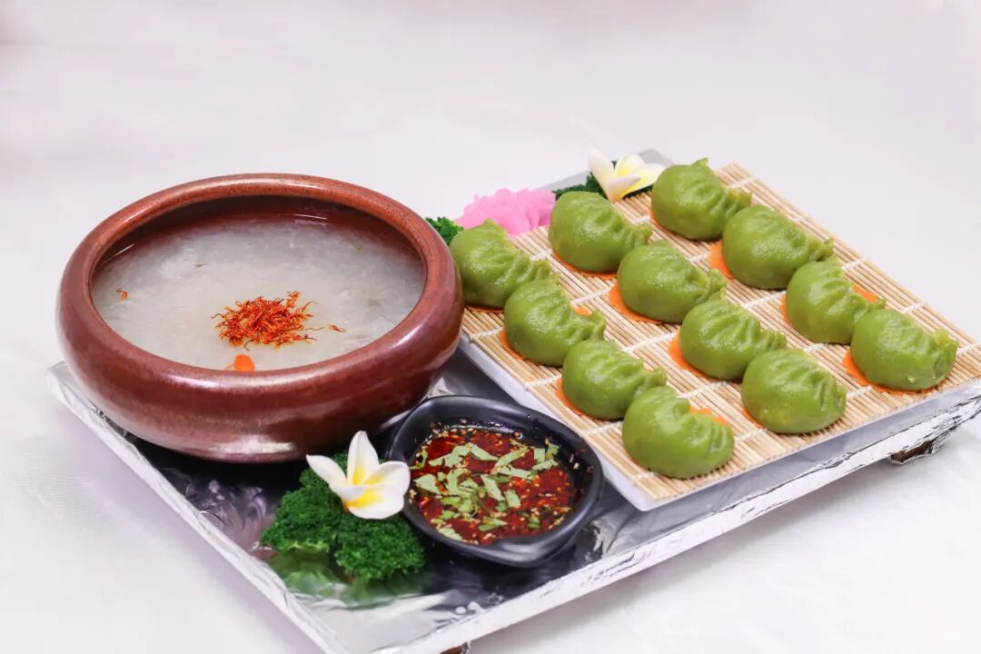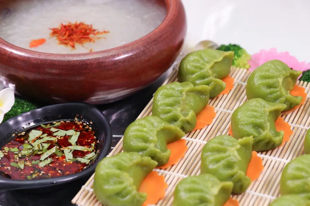 石斛羊肉饺内陷料为羊肉,精选本地肉质细嫩的黄山羊,富含丰富的蛋白质和维生素,补肝明目、温补脾胃、肝肾、补血温经,低卡低脂,是健康轻食生活必备。不止内馅惊艳,饺子皮亦极为出挑,采用石斛打汁和面,巧妙利用食材的天然本色,手工擀制绿色面皮,不止颜值高,口感更是劲道醇香。饺子汤汁四溢,格外鲜甜,富有美感,既能增加食欲,又增添了营养和膳食纤维,堪称色香味俱佳,搭配一碟陈醋,味美又解腻。