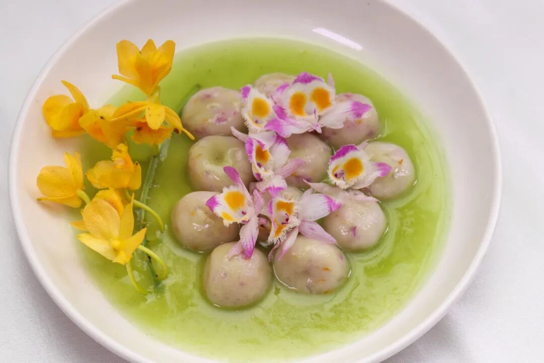 采用新鲜石斛汁和石斛花和面,做成珠子,下沸水煮熟掏出,石斛汁勾芡,仿佛一个个穿着紫色碎花裙的仙子游荡在碧绿的湖水中。