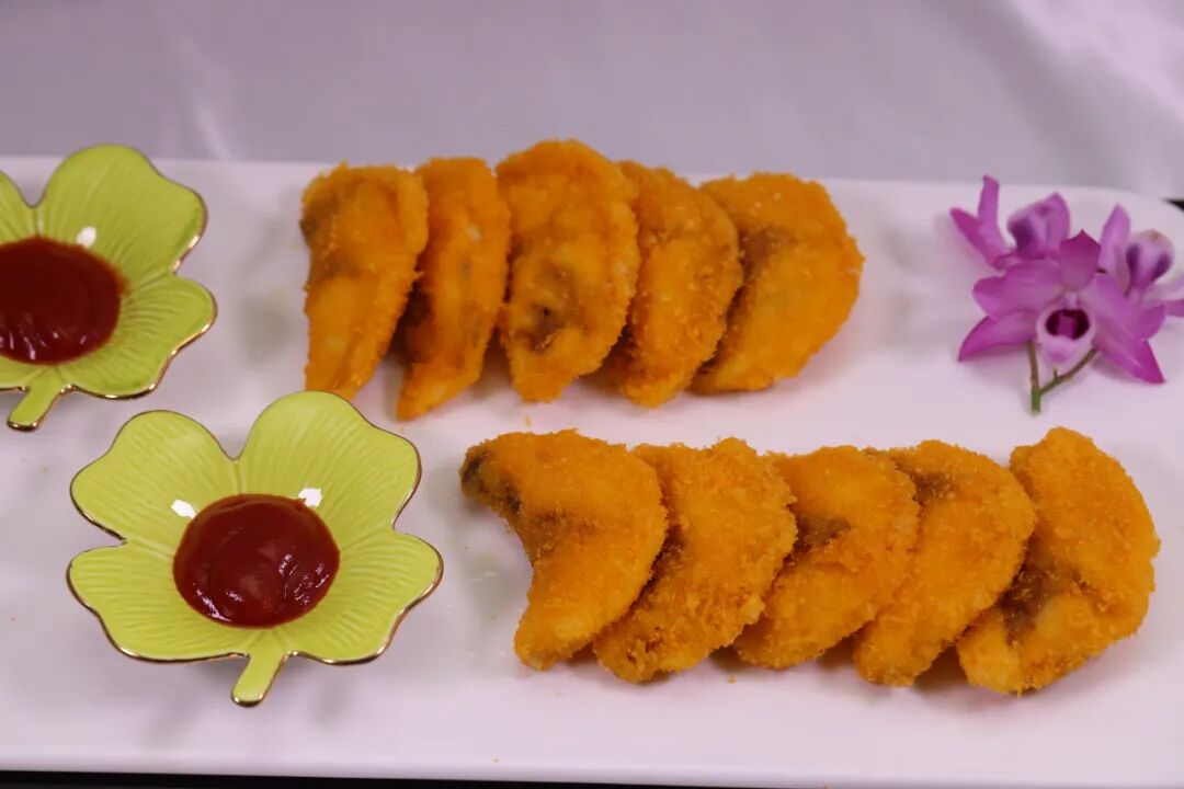 通过低温炸制,色泽金黄,外酥里嫩,配以新鲜紫皮石斛汁,保留了食物的原味、香味和营养,口感丰富。