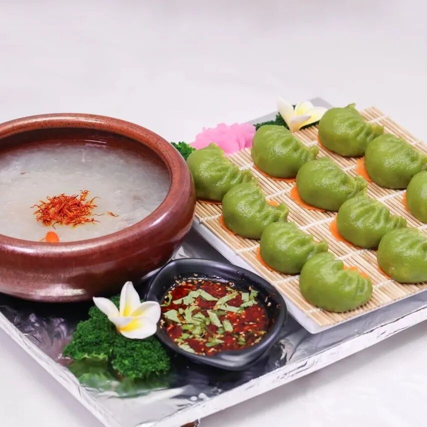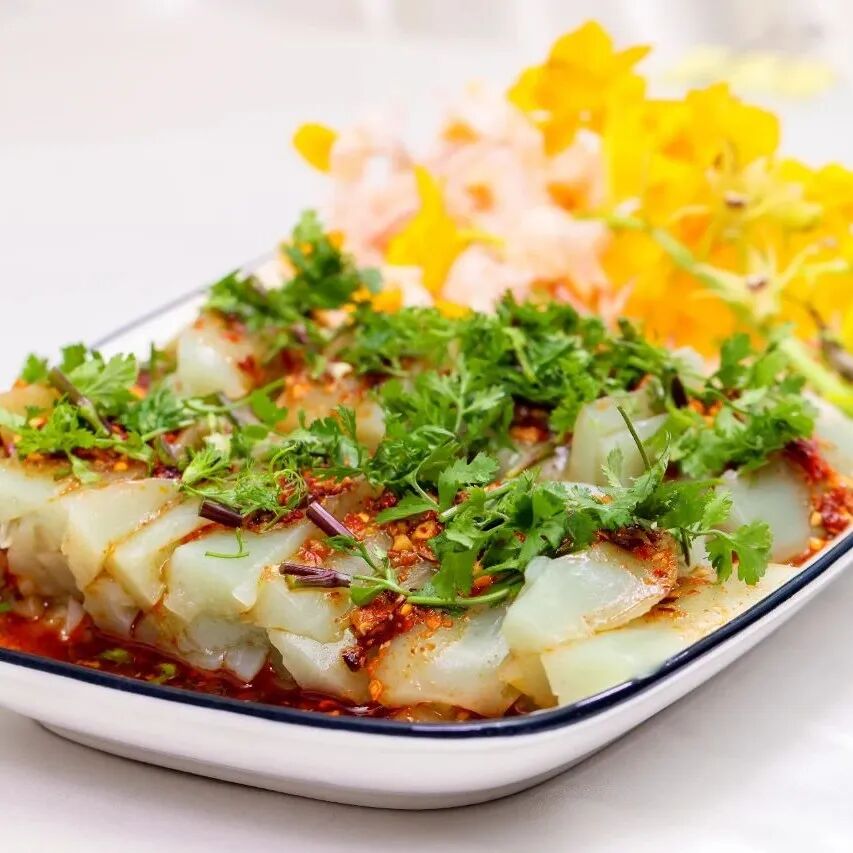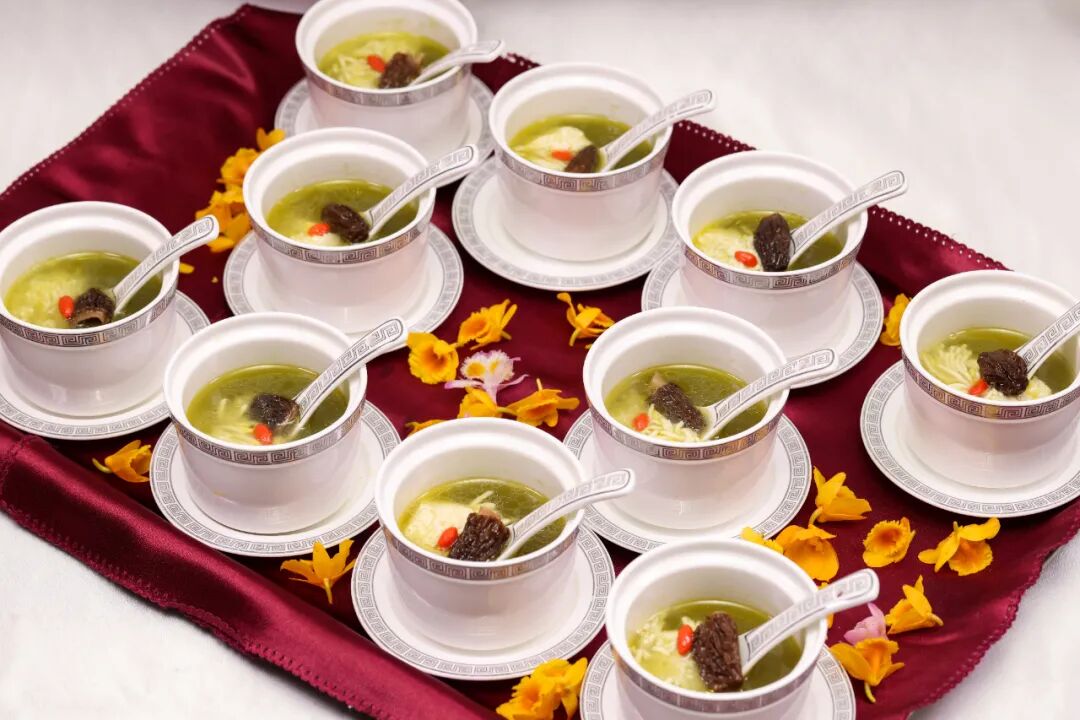 这道石斛菊花豆腐的精华就在于“石斛汁”作为这道菜的汤底,用石斛汁熬制成的浓汤,清香浓郁,口感爽滑,色泽鲜绿透亮,其次就是将优质的肉质豆腐切成一团细丝,要求粗细均匀,放在石斛汤汁中像一朵正在盛开的菊花,代表着花开富贵,并且孕育着龙陵石斛产业的磅礴发展。