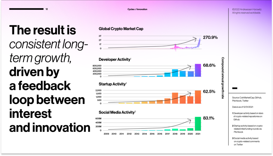 a16z 将这个循环称之为“加密货币价值——创新循环”,在每一轮循环后,尽管货币价值会下跌,但依然会有更多开发者和初创企业留在整个生态环境中,让整个市场和产业逐步发展。