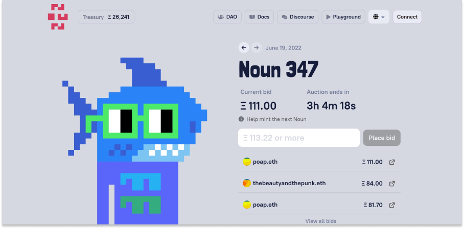 Nouns 将自己形容为一个“提升区块链虚拟头像社群环境的实验项目”,该项目希望能够“将身份识别、社群管理以及区块链头像价值相整合,进而被社群所利用”。在过去 347 天内,每天都会有一个 Nouns 虚拟头像展开竞拍。全世界任何拥有足够多 ETH 的用户都可以参与拍卖。