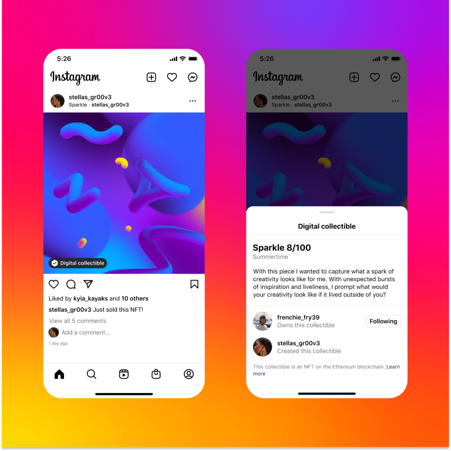 关注 NFT 的还有曾经作为 Web2 创企代表的 Instagram,该平台在 2022 年 5 月宣布,将允许创作者和 NFT 收藏者在自己的账号上展示 NFT 藏品。