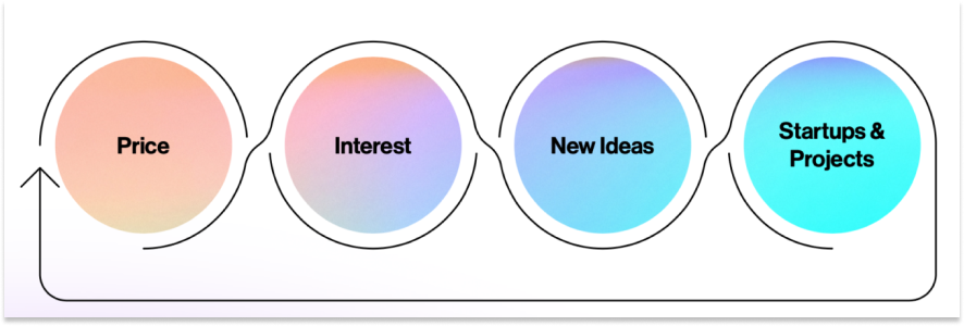 从另一个角度来看,舆论热度和炒作也可以加快创新和发展。a16z 旗下加密货币风投基金 a16z Crypto 曾发布《State of Crypto》调查报告,该报告就解释了市场价值、外界兴趣、新想法以及初创企业/项目之间互相循环派生的关系。市场行情越好,投资人就越对这一产业感兴趣,随后吸引新一批创业者产生新的想法,并最终转化为初创企业,拉动市场行情。