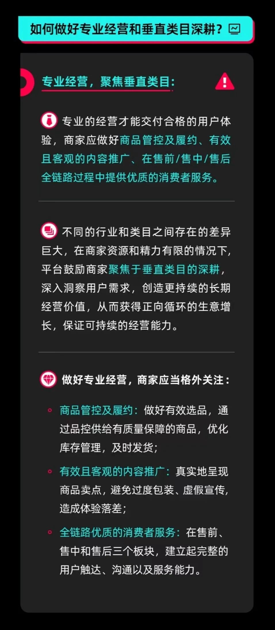 为进一步升级优化消费者购物体验,帮助商家降低店铺差评率,完善平台的生意布局并提升可持续经营能力,近日,TikTok Shop 官方发布了关于商家专业经营的提倡与建议,鼓励平台商家进行专业经营,聚焦垂直类目,以优化消费者体验,实现可持续的经营发展。专业的经营能力是交付合格用户体验的基础。对此,TikTok Shop 提倡商家全方位、多角度落实细节把控,为店铺长久经营做好准备。如何落实到具体层面?在商品管控方面,商家应有效选品、加强品控,为消费者提供过有质量保障的商品,优化库存管理,及时发货;在内容推广方面,商家应真实地呈现商品卖点,避免过度包装、虚假宣传,造成消费体验落差;在消费者服务方面,商家应在售前、售中和售后三个版块建立起全链路的完整用户触达、沟通以及服务能力。由于不同的行业和品类之间存在的差异巨大,因此,TikTok Shop 鼓励商家在资源和精力有限的情况下优先做好垂直类目的全链路运营。只有聚焦于垂直类目的深耕,才能深入洞察用户需求,创造更持续的长期经营价值,从而获得正向循环和经验积累,为未来的长线经营提供源动力。![]()