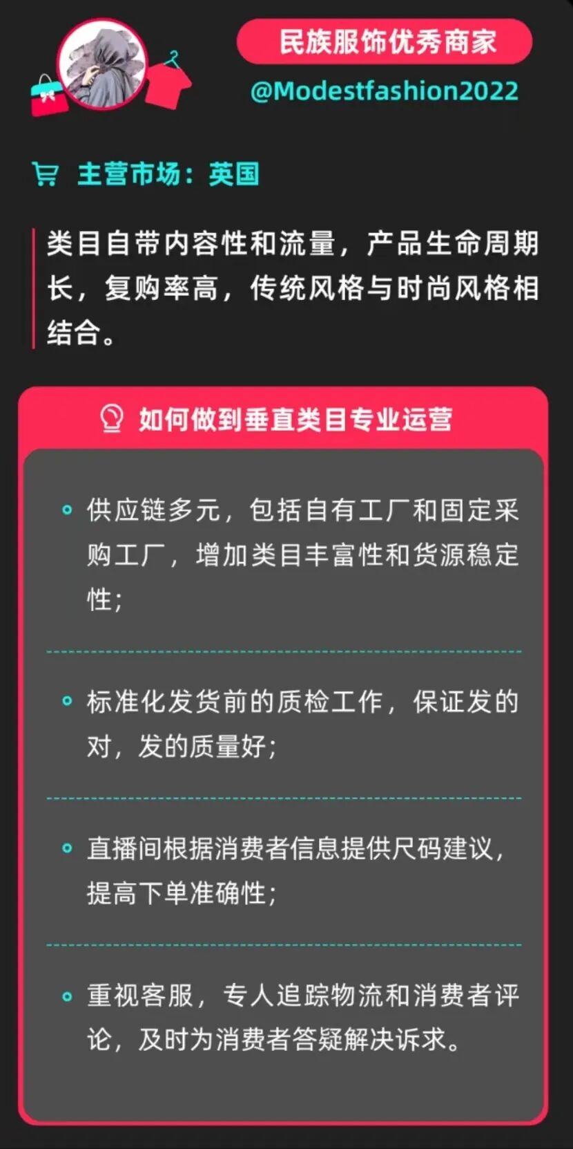 对此,一位跨境从业人员表示,根据 TikTok Shop 的个性化推荐,商家账号的标签越清晰,被推荐到的人群就越精准,意味着转化的可能性也就越大,这或许是 TikTok Shop 推荐商家“专业经营、深耕垂类”的一大原因。一位此前经营独立站百货的商家称,最近注意到 TikTok 电商的治理政策更严格,官方非常重视差评率,作为商家一定要重视这一指标,而专注垂类运营能够帮助商家聚焦、提升专业度,从而也能提升店铺的 NRR 数据表现。其实,电商经营的核心还是产品和服务。只有向顾客提供优质产品,才能积累口碑、吸引新老消费者,实现可持续经营。小编注意到,近期,TikTok Shop 为优化消费者购物体验,陆续采取了一系列措施,帮助商家提升服务质量、把控商品质量。早些时候,针对少数账号恶意录制并盗用其他商家和达人的电商内容牟利的现象,TikTok Shop 就更新了规则“禁止盗播,上线新规保护原创内容”:自 2022 年 12 月 21 日起,禁止预先录制和重新上传其他达人的直播内容,对于搬运内容的账号处罚包括取消流量、曝光、平台推荐,移除商品链接甚至电商权限,并将对违规的商家和服务商进行公示。盗播带来的一大问题是,商家在直播间展示的产品并不是自己真正售卖的,消费者一旦下单、收到的产品不是展示的产品,对于平台的信任和长线经营来说会是一大伤害。禁止盗播,是从基础上保证“货对版”。而关于如何把控商品质量、考察服务质量,当前 TikTok Shop 核心考核的指标有差评率、延迟履约率等。其中,差评率作为核心评判指标之一,可以分为商品安全差评、商品差评及店铺差评。特别值得注意的是,TikTok Shop 对商家进行考核时,重点关注的是商责差评,商家需特别重视因为商品安全、质量等导致的差评,非商责差评如物流差评则不会被包含在内。根据官方建议,通用的来说,商品进行产品安全认证能够有效降低差评率。而针对一些常见的差评问题,其实可以通过精细化运营提前规避。对于数码 3C 产品,常见的问题可能包括下单型号与到货型号不一致,或消费者不会使用产品却误以为产品有问题等原因导致的差评。对于此类问题,商家可以在发货前仔细核对打包并做好售后预案,引导消费者加强沟通、优先和商家反馈问题,并告知消费者可提供换货服务;此外,在提升产品力上,可以协调厂家,提供多种语言的使用说明书,并且在商品详情页上传使用教学视频,并罗列包裹内物品清单,便于消费者核对零部件是否齐全。举例来看,手机配件产品“轻小件、高复购、高流量”一直是跨境的热卖产品。手机配件店铺 jsove 自有手机壳工厂以及完善的产线团队,供应链优势使得该店铺产品材质更新快、产品型号多。并且,在提升消费者购物体验方面,除了具有标准化工厂产品质检流程以保证产品交付质量外,jsove 还很重视发货时效性,客服轮班每日在线时间长达 17 小时,与消费者保持紧密联系。又例如,服饰产品容易因为面料材质与消费者预期不同、服装爆口、尺码不符等原因收到差评,商家可以多上传面料对比图、在详情页提供目标国当地尺码参考。此外,还可以在详情页引导消费者,如果不会选尺码可以私聊商家沟通,亦或是展示自己的测量方式和模特身材数据等信息供消费者参考。服饰店铺 Modestfashion2022 拥有自有工厂和固定采购工厂,大大保障了其品类丰富性及货源稳定性。在“有好货”的基础上,商家还很重视消费者购物体验,在消费者拍下商品前,在直播间根据消费者信息提供尺码建议,提高下单准确性,在订单生成后标准化质检工作,确保发货的准确度。并安排客服追踪物流及评论,为消费者答疑解惑。“好产品、好内容、好服务”助力该商家打造了生命周期长、复购率高的大单品,赢得了生意突破性增长。![]()