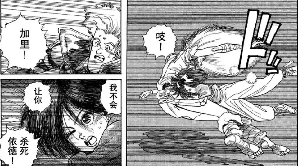 在这里,加里是蘸着地下的煤油在脸上画了两个痕迹,但在ova和电影中,加里都是因为马卡克杀死了一只狗狗而被激怒,蘸着狗狗的鲜血化身为战斗天使的。