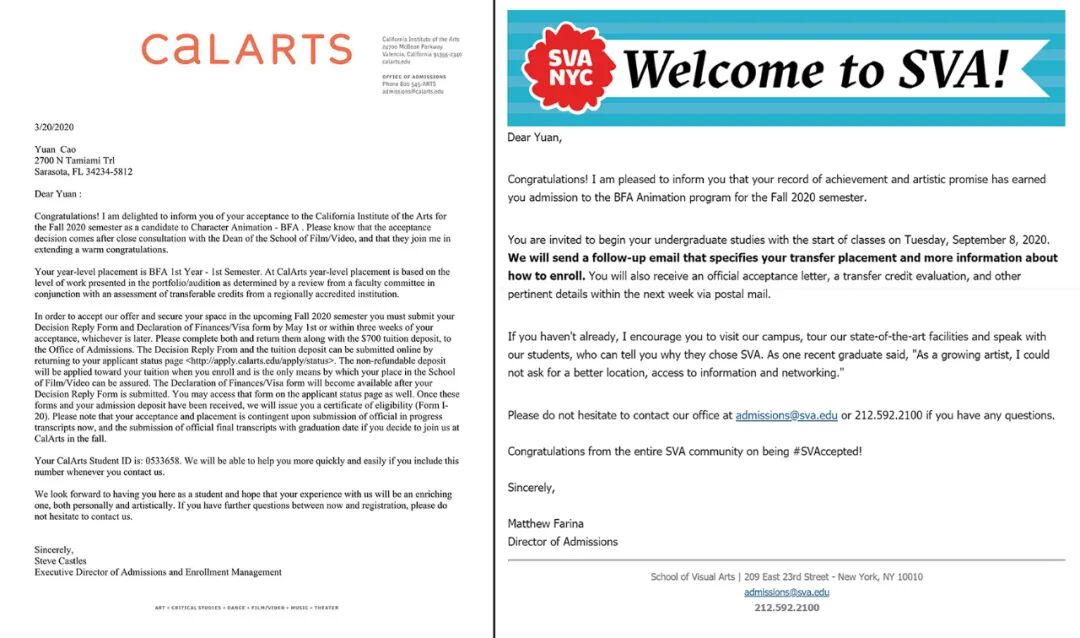 2020年3月,我正式收到了来自CalArts和SVA(纽约视觉艺术学院)的录取通知。收到CalArts通知的那天,我在房间里叫了出来,这份结果,我真的等了太久了。
