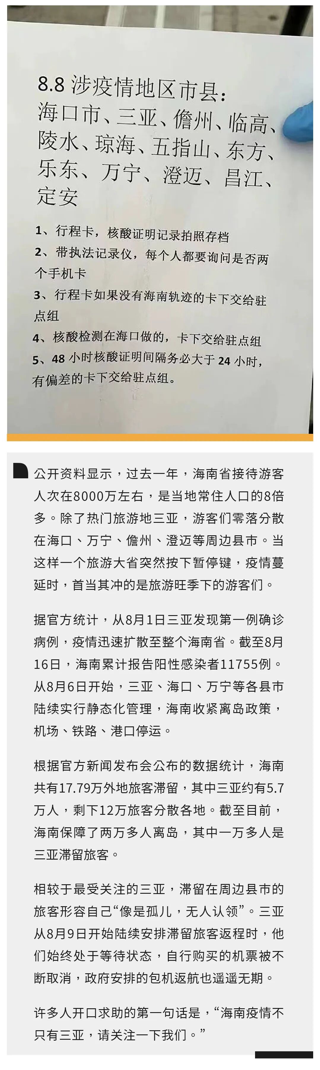 大家才察觉,行程卡避开三亚没有用,各个低风险县市陆续实行静态管理,整个海南都收紧了离岛政策。除了早已进行管制的三亚凤凰机场,从8月6日开始,海口美兰机场、琼海博鳌机场和各个港口都要求持48小时2次核酸证明,才可以离岛。当天傍晚,政策更改为持72小时3次核酸离岛。7号,机场和港口要求涉疫区游客持7天5检核酸阴性证明。