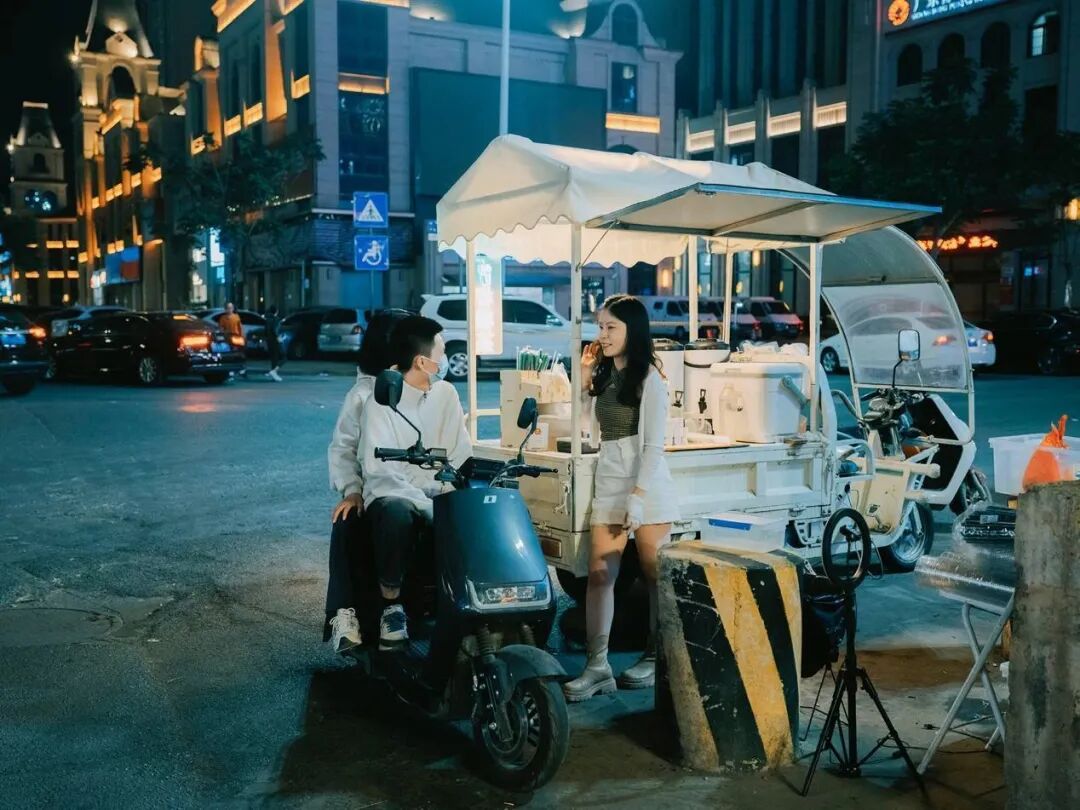 我第一次独立摆摊是卖烤肠,当时用我攒下的1000块钱,买了一个折叠桌和煤气、调料、烤肠,用电动车拉着去隔壁村摆摊。后来,又用两个星期的收入买了一台小推车,这样就方便多了。