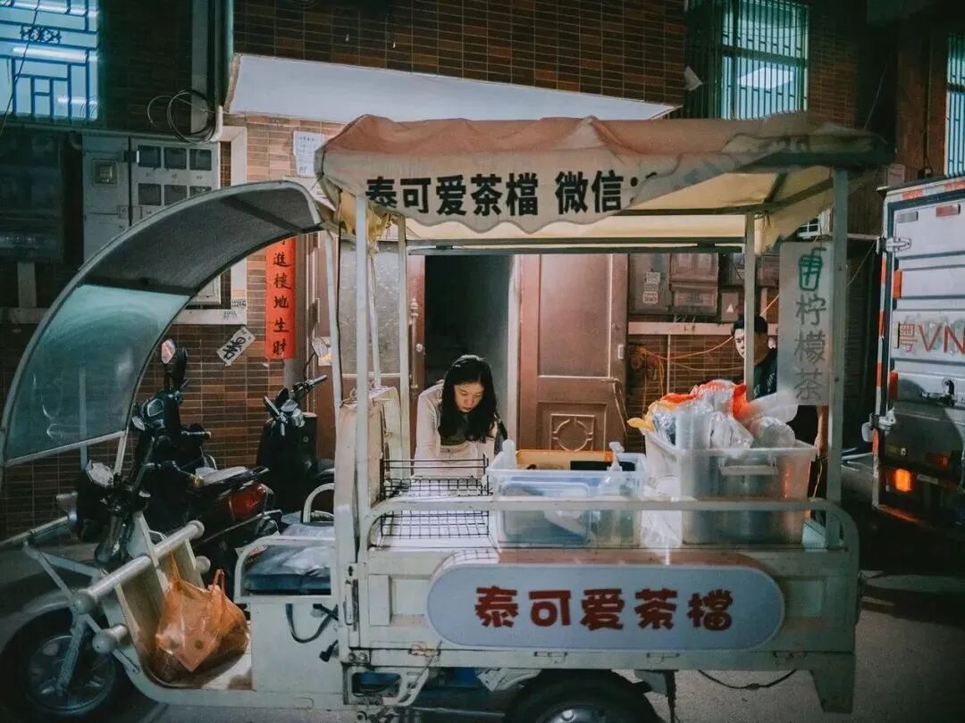 刚开始我还不会开,好在三轮车摔不倒,只要把握好刹车,慢慢就学会了。我还记得我第一天出摊的时候非常尴尬,我的推车是粉色的,吸引了很多人来围观,被好多双眼睛看着,我做奶茶的时候手都在抖。
