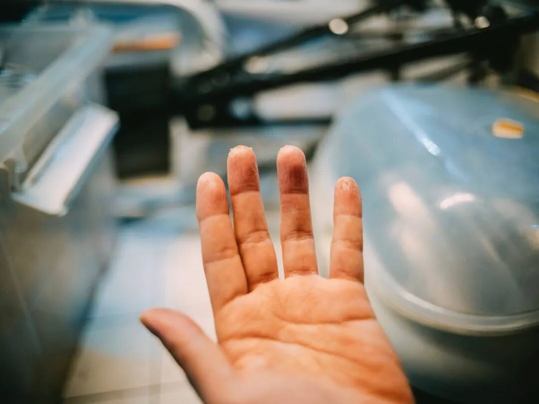 ●因为长时间接触水,谢佳娜双手已经脱皮。