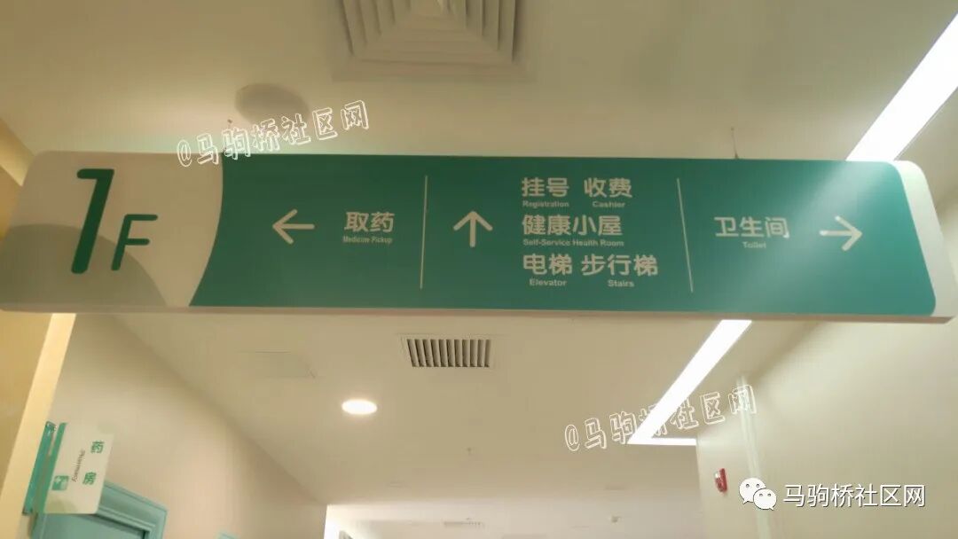 一层配有挂号收费窗口、取药窗口、健康小屋和卫生间,检查的科室都在二层,患者可步行或乘坐电梯到二层问诊。