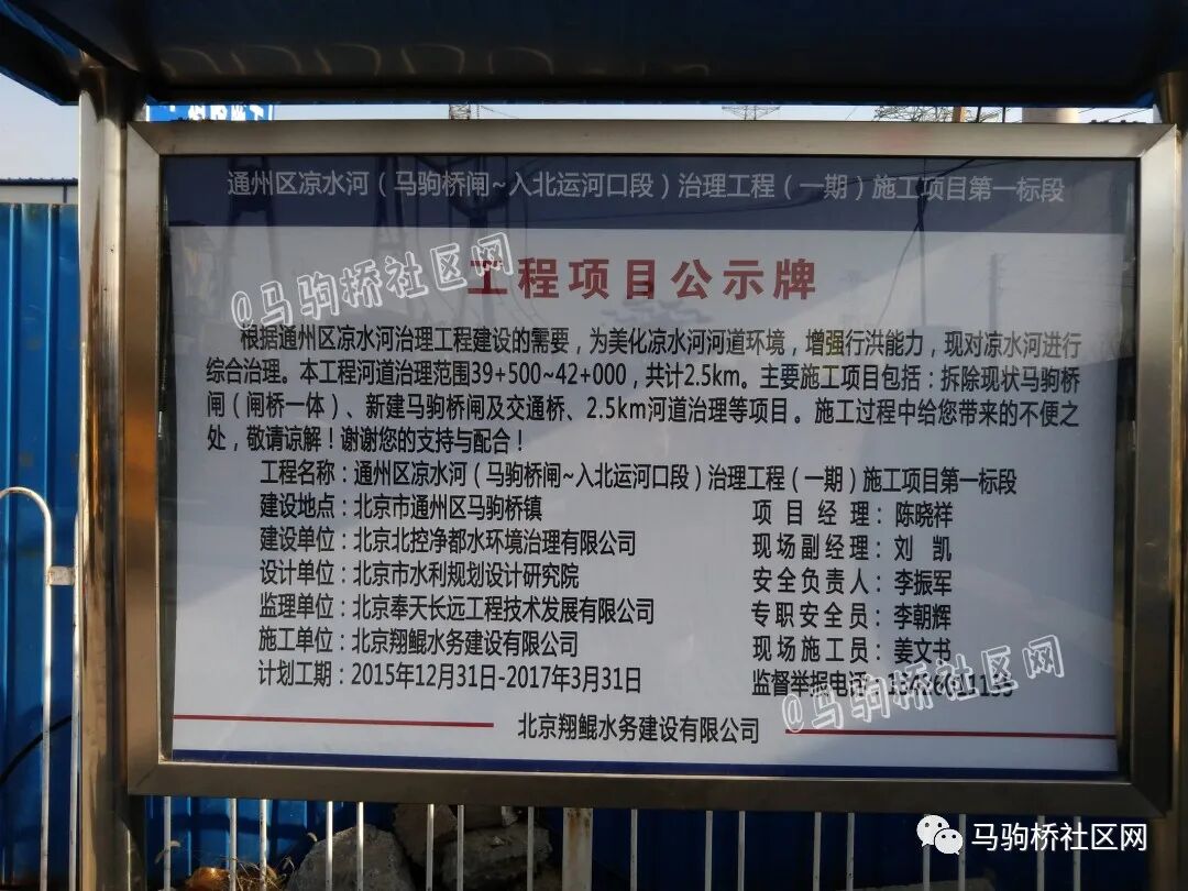 2016年凉水河马驹桥段水闸改造,2016年底对此桥进行重新设计建造。此次设计为提前满足日益增加的马驹桥及以南区域与开发区通勤需要做准备,进行加宽设计,双向四条机动车道和非机动车道与人行步道。