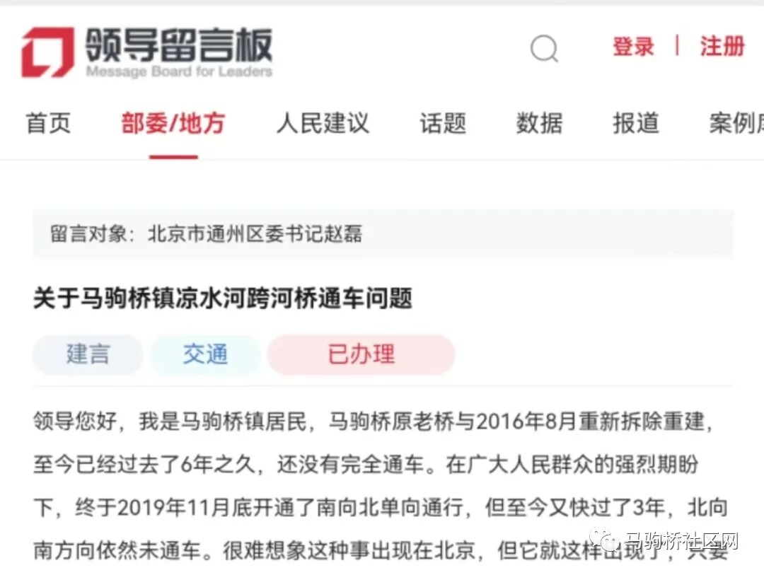 马桥网友在留言板中提及关于马驹桥镇凉水河跨河桥通车问题建言,官方回复需要等到2023年。