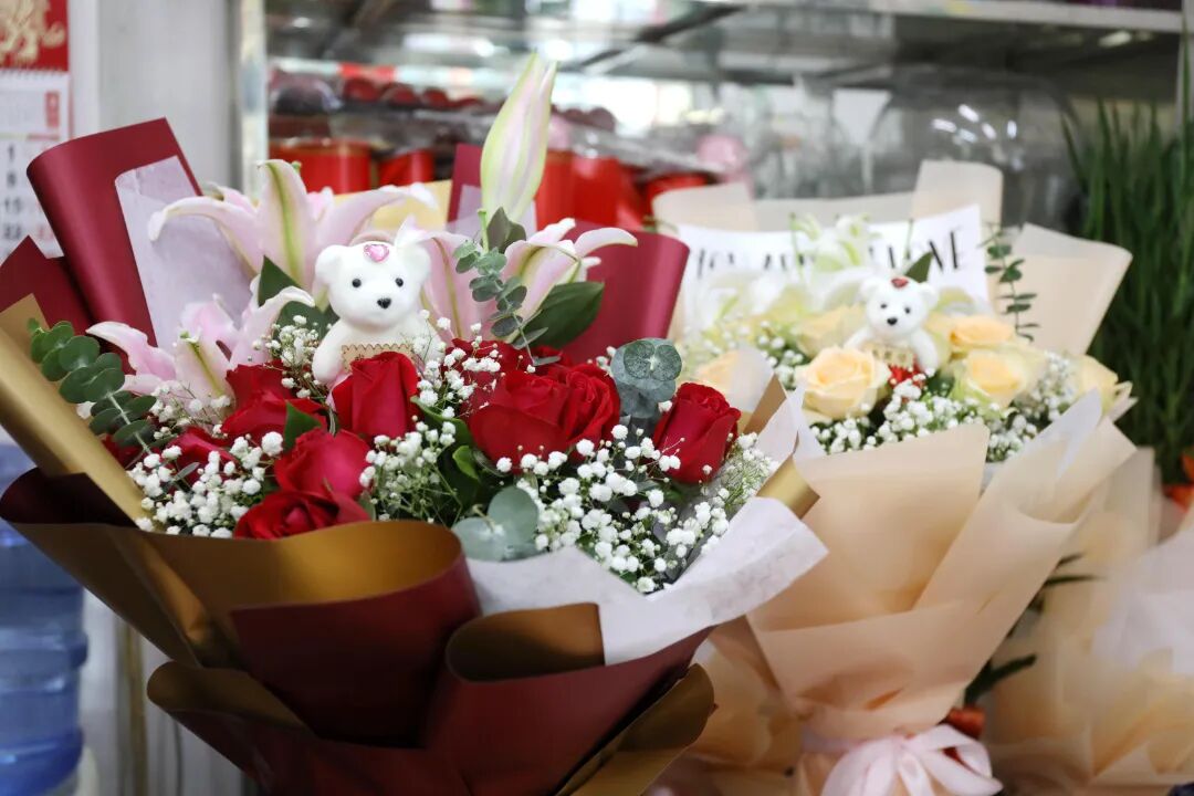 店内的红玫瑰摆在显眼位置,不少花束已插在花泥上,只剩外层包装了。店长赖女士介绍,这几天订单比平日多了一些,她最快10分钟就能包好。顾客喜欢预订11枝、19枝、33枝等花束,这些数字有着长长久久、一生一世等美好的寓意。除了鲜花花束,也有一些顾客会拿着现金、零食等过来包装,形式比较新颖。