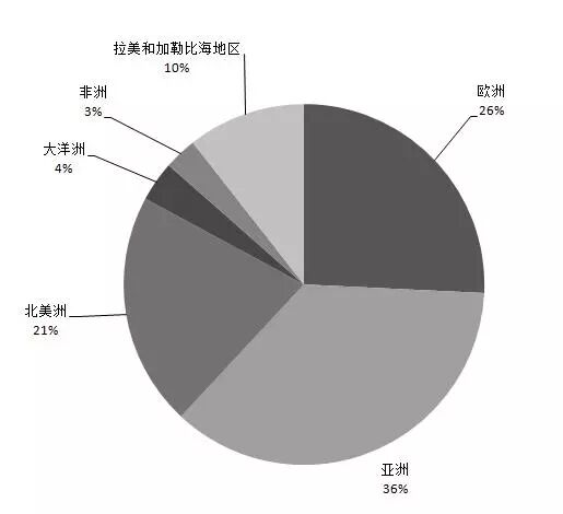从全球FDI流入的洲域上看,2017年亚洲区域超过欧洲区域,获全球FDI最多的流入量,占投资总额的36%。之后依次为欧洲26%、北美洲21%、拉丁美洲和加勒比海地区10%,以及大洋洲4%、非洲3%。