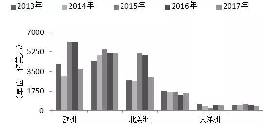 【二】欧洲、亚洲、北美洲为主要投资区域,中国对美国投资大幅下降
