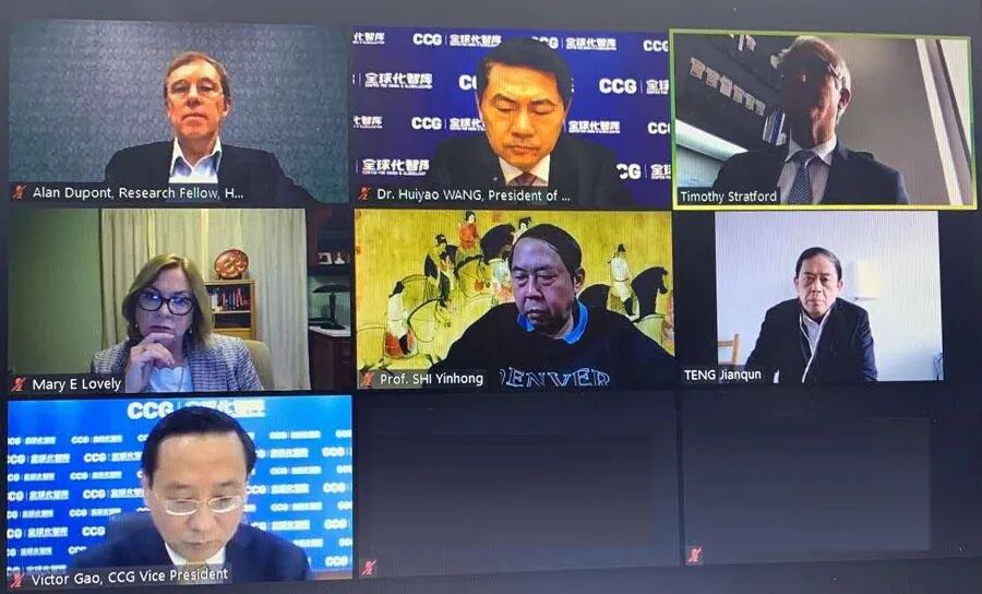韩礼士基金会研究员、Cognoscenti Group首席执行官Alan Dupont,彼得森国际经济研究所研究员、雪城大学麦克斯韦公民与公众事务学院教授Mary Lovely,中国人民大学国际关系学院学术委员会主任、美国研究中心主任、CCG学术委员会专家时殷弘,中国国际问题研究院美国研究所所长、高级研究员滕建群,科文顿·柏灵律师事务所总经理、前美国助理贸易代表Tim Stratford,CCG主任王辉耀就特朗普或者拜登领导下的美国政府的中国策略,中美“脱钩”的意愿和可能性,美国大选前后的中美关系等议题进行研讨。研讨会由CCG副主任高志凯主持。