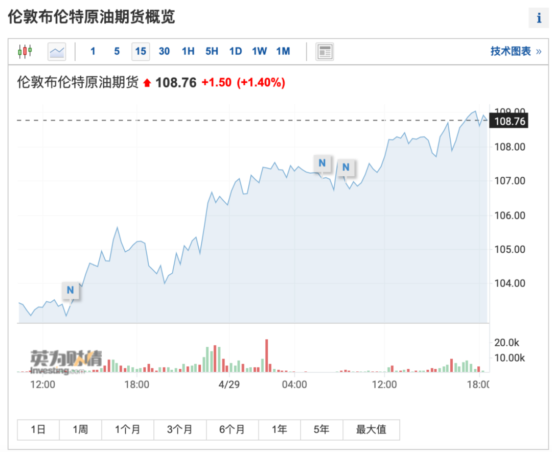 受这一消息刺激,布伦特原油、美国WTI原油价格再度双双大涨,4月29日美国WTI原油期货价格一度涨至108美元/桶的高位,创4月18日以来的收盘新高,布伦特原油期货价格更是一度逼近110美元/桶,随后稍有回落。