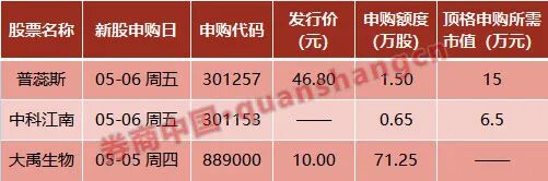 本周共有3只新股发行。其中,周四1只:大禹生物,为北交所新股;周五2只:普蕊斯、中科江南,均为创业板新股。