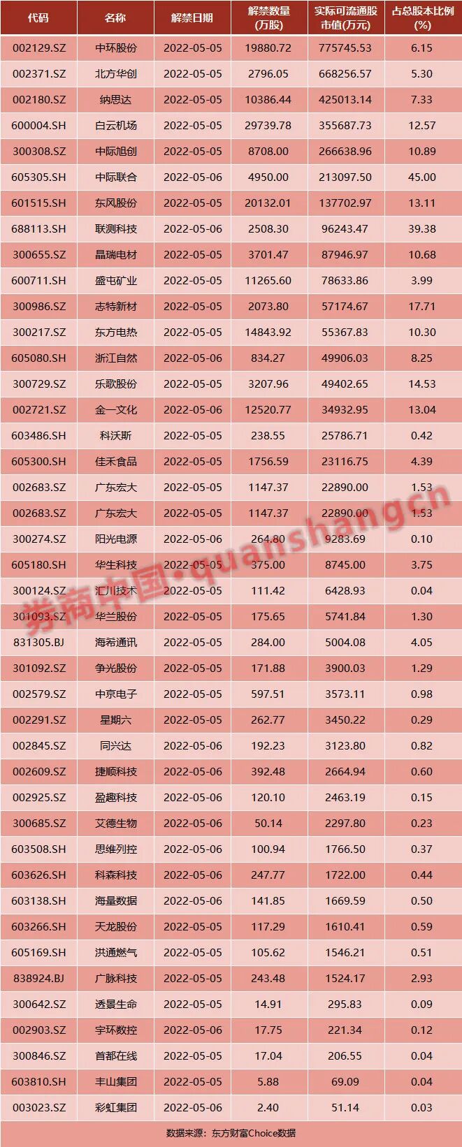 数据显示,本周(5月5日~5月6日)共有42家公司限售股陆续解禁,合计解禁量15.59亿股,按4月29日收盘价计算,解禁市值为351.38亿元。
