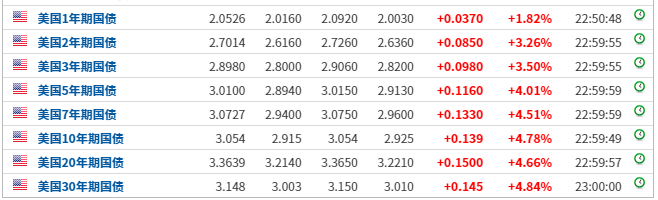 这一惊人之变化亦引发了其他市场变局,美国长期限国债收益率几乎全线上涨。其中,指标意义强烈的十年期国债收益率一举突破了3%。
