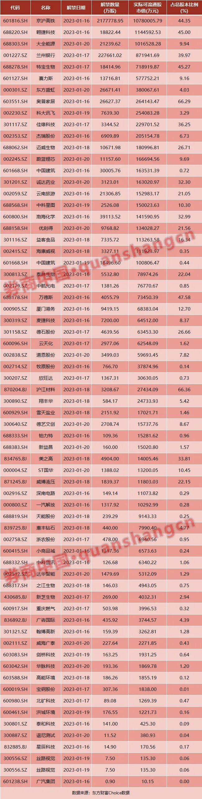 数据显示,本周(1月16日~1月20日)共有67家公司限售股陆续解禁,合计解禁量277.21亿股,按1月13日收盘价计算,解禁市值为1888.94亿元。