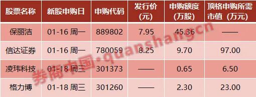 本周(1月16日~1月20日)共有4只新股发行:周一2只:保丽洁、信达证券;周三2只:凌玮科技、格力博。