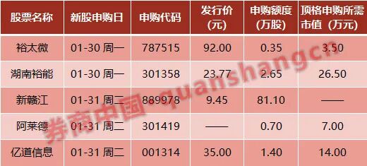 本周(1月30日~2月3日)共有5只新股发行:周一2只:裕太微、湖南裕能;周二3只:新赣江、阿莱德、亿道信息。
