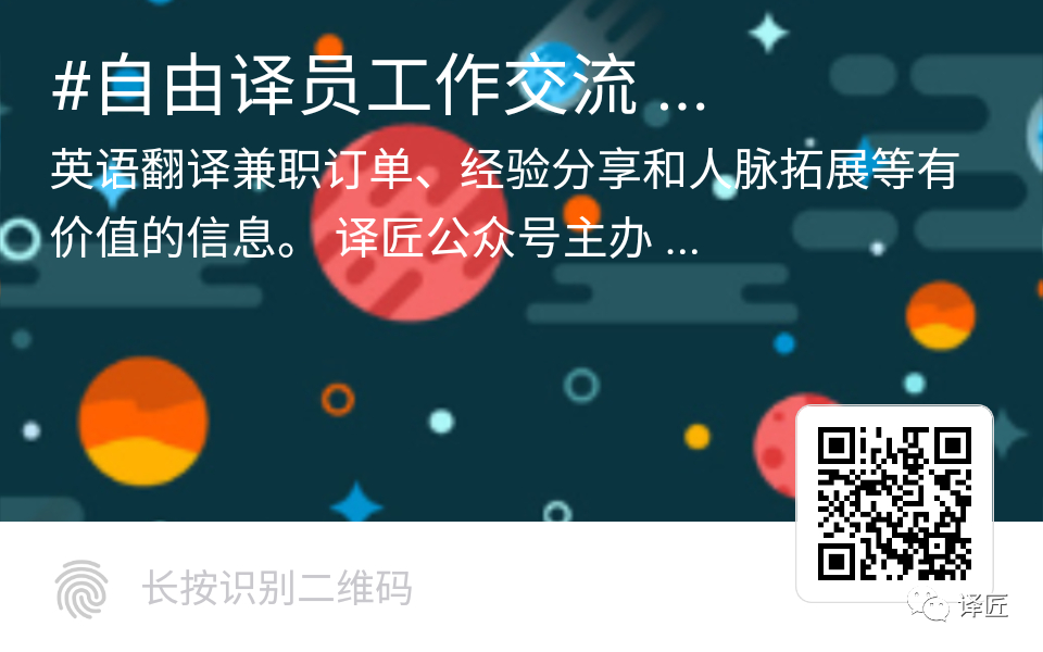 小组年费88元/年,可扫下述二维码进入(或阅读原文),或进入找到组织小程序搜索。兼职变现,结交译友,一起打造诚信靠谱的自由译员工作交流小组,欢迎小伙伴多多支持。
