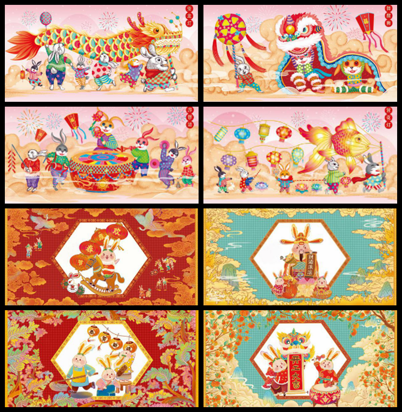 2023中国邮政贺年有奖明信片将发行2套。邮资图及邮资面由著名设计师潘虎设计,画面中的兔子源于敦煌莫高窟三兔共耳的图案,表现了三兔首尾相接、互相追逐的场景,寓意奔跑不息、逐梦不停。